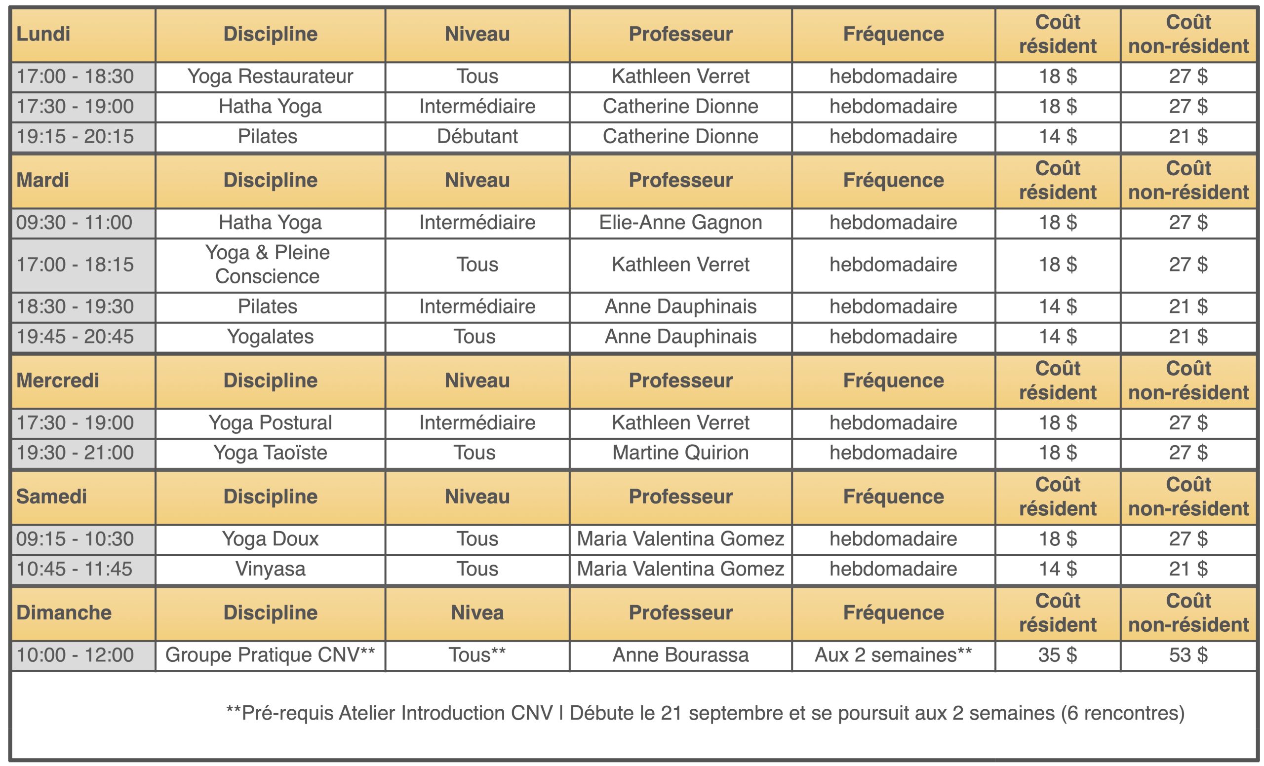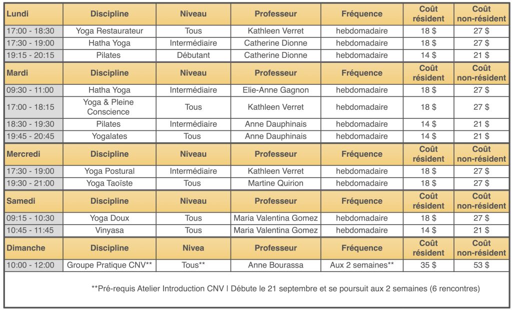 Note : Il est toujours possible de vous inscrire à la session à un tarif plus avantageux que les cours à la carte (au prorata du prix de la session régulière) en contactant le Service aux membres 418-688-3003 ou par courriel : accueil@yogaquebec.com